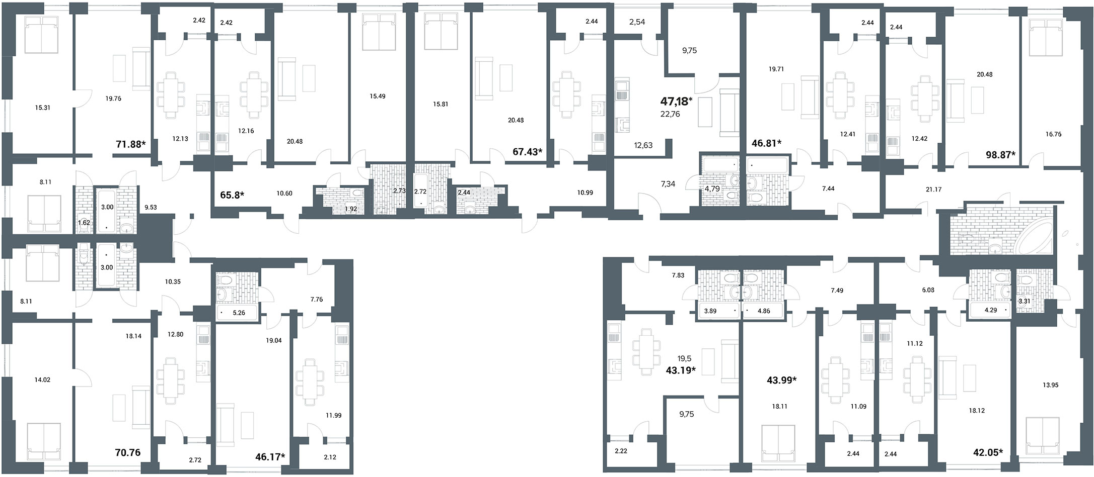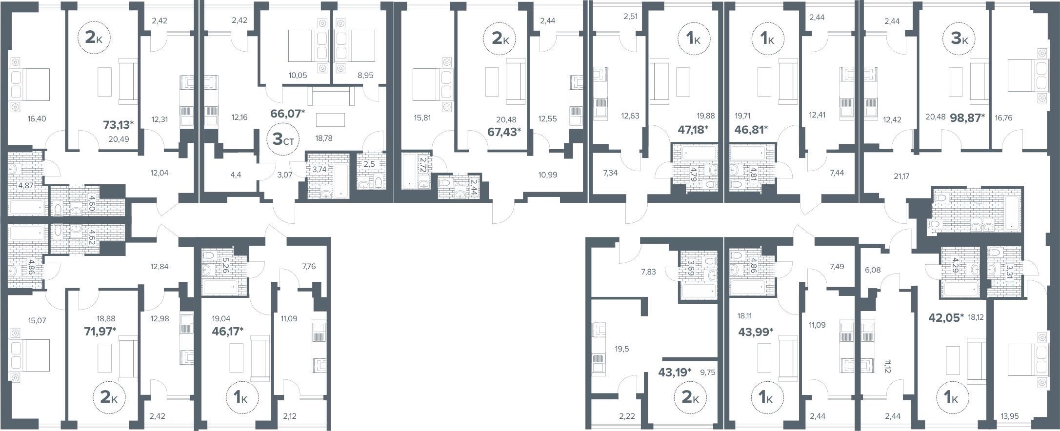 а также 2-3к студий, площадью 46 м² и 65 м².