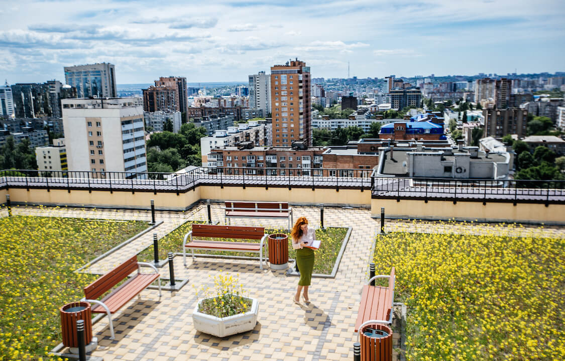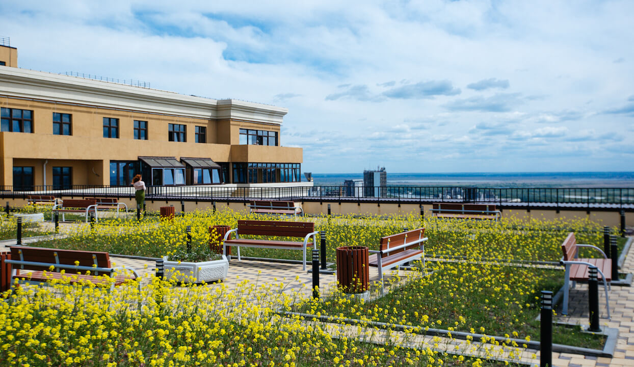 Две террасы на крышах домов обустроены для прогулок и отдыха. Площадки открыты только для жильцов дома и открывают вид на реку Дон и панораму города.