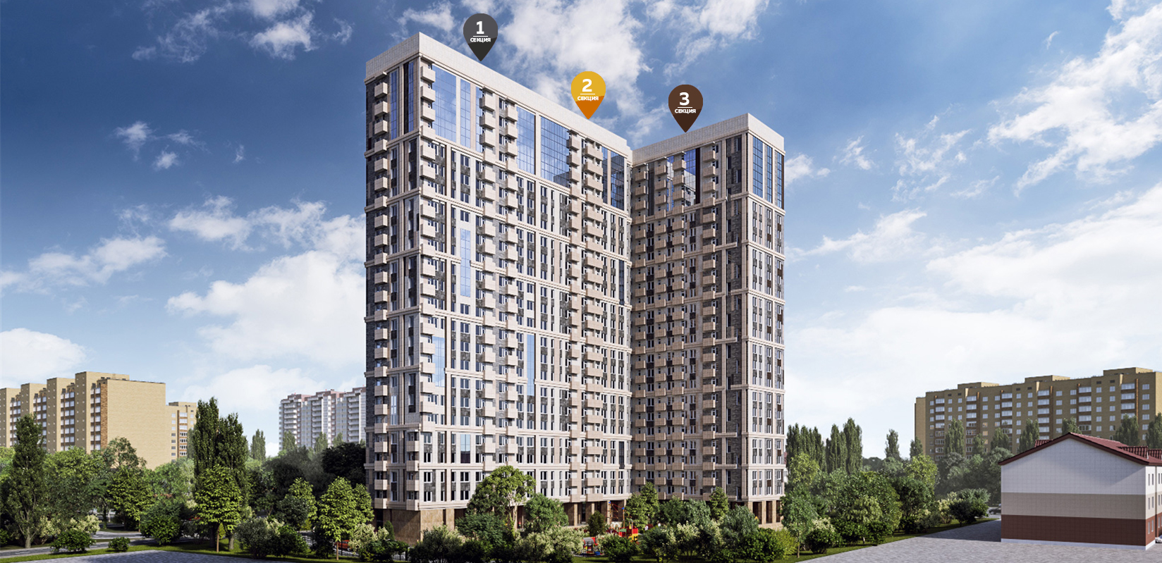 Новый ЖК разделен на три секции. Общее число квартир: 460. На территории есть охраняемый паркинг для жителей и их гостей. Для покупки уже доступны следующие варианты жилья: