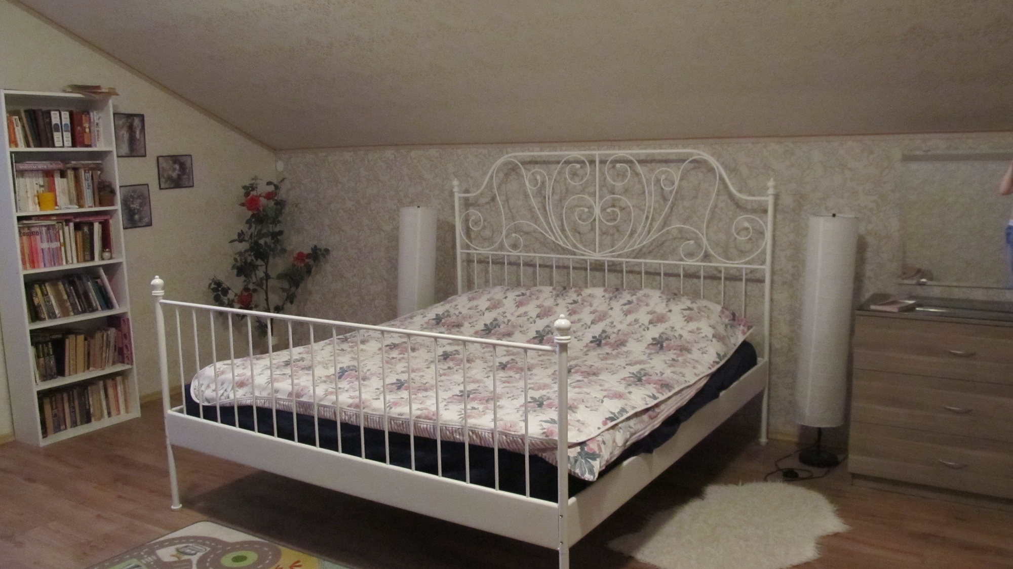 На первом этаже расположены прихожая, холл, спальня, детская, гостиная, кухня, 2 санузла (один с ванной), на мансарде - спальня, кабинет, гардероб и санузел.